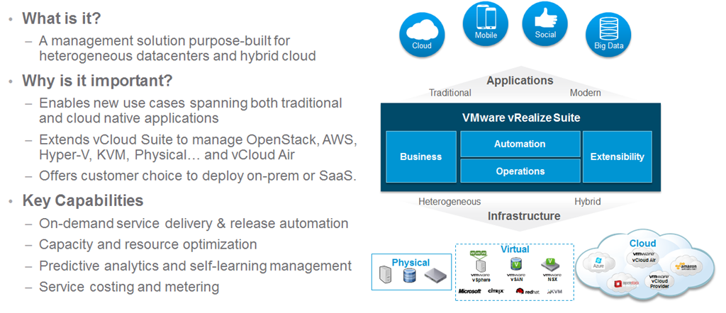 VMware vRealize is changing the name of the management solutions into simpler packaging and suites and as announced at VMworld US, vRealize Air Operations,Automation and Business will be available soon to provide a new SaaS solution for VMware customers via the renamed vCloud Air offering.