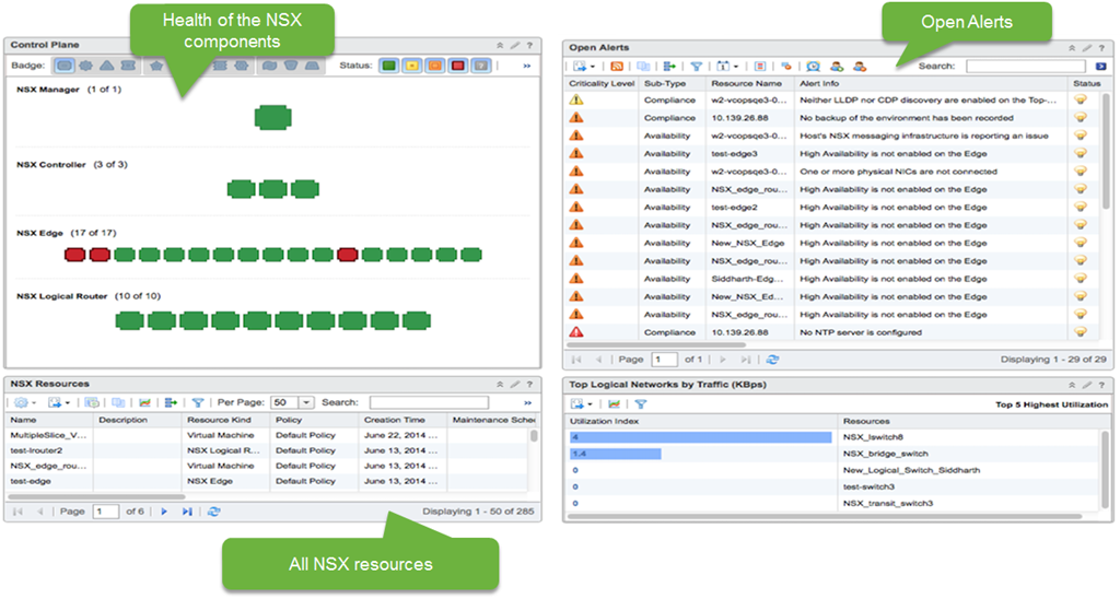 All the alerts related to NSX are captured in Open Alerts widgets. This is based on hard threshold violations. We can see a number of High Availability violations. We have 40-50 alerts that are configured out of the box. We have detailed documentation on each of these metrics and what the alerts mean.