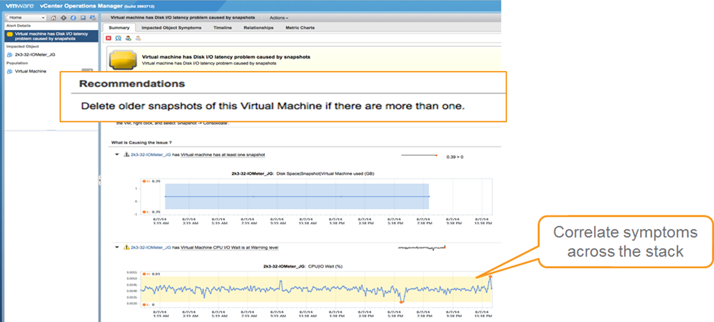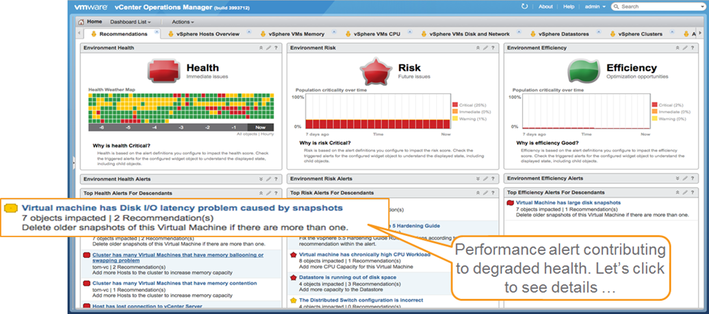 The management dashboard of vRealize Operations 6.0 has maintained the same three panels on health Risk and Efficiency to provide viewing and reporting of immediate and future problems as well as opportunities to optimise. With vRealize Operations 6.0 you now have a new section below each of the three panels there are now problem alerts which give you correlation of problems and the ability to click the alerts to see the details as shown below.