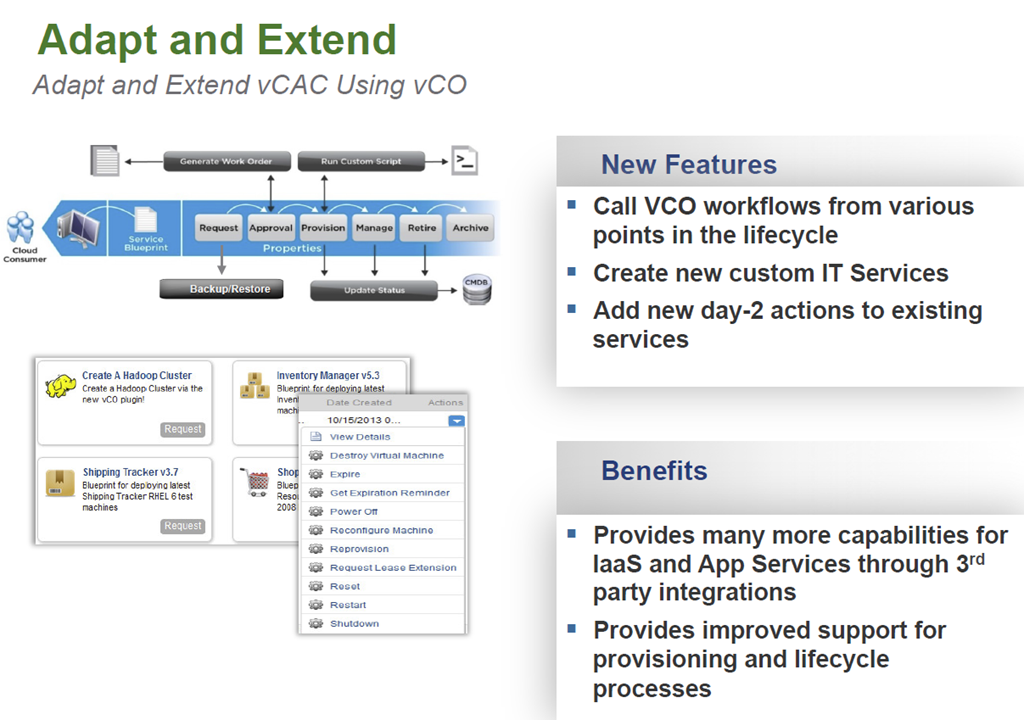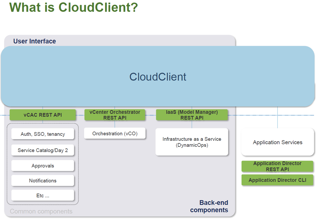 - Command-line utility that provides verb-based access with a unified interface across the vCAC APIs (including IaaS, Applications, vCO)